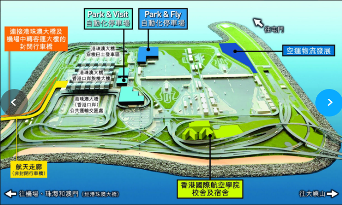 毗邻机场的港珠澳大桥香港口岸人工岛将重点提升机场服务以配合机场城市的发展。机管局计划在香港口岸人工岛发展自动化停车场,分阶段提供约6000个泊位予转机及访港旅客使用。经港珠澳大桥到香港国际机场转机的旅客可以通过封闭式行车天桥直接前往机场登机闸口,过程中无需办理出入境手续。访港旅客则可通过“航天走廊”前往SIKYCITY航天城或是香港其他地区。