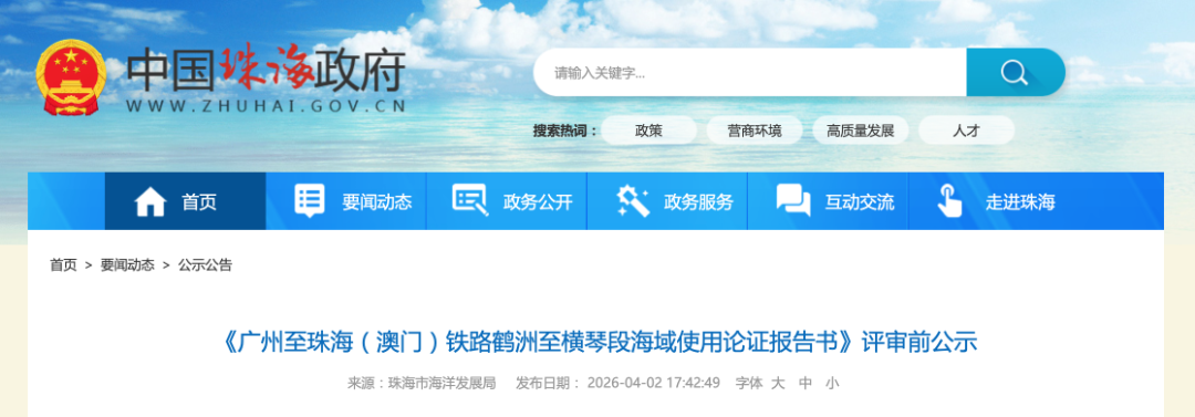 近日,珠海市海洋发展局将《广州至珠海(澳门)铁路鹤洲至横琴段海域使用论证报告书》(以下简称《报告书》)有关信息向公众公示。