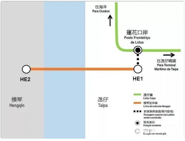 The Hengqin extension line is a key cross-border infrastructure project between Macao and Hengqin, officially starting on March 18, 2021. The project includes stations at "HE1" next to the Taipa Line Lotus Bridge Station and "HE2" located in the basement of the Hengqin Port.