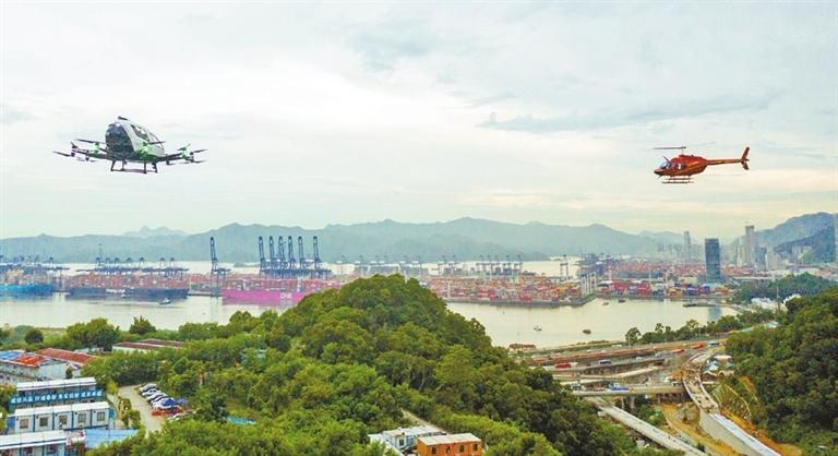 An eVTOL aircraft and a helicopter are seen during an eVTOL test over the Yantian Port.