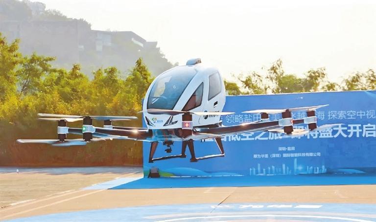 An eVTOL aircraft takes off during a flight test in Yantian.