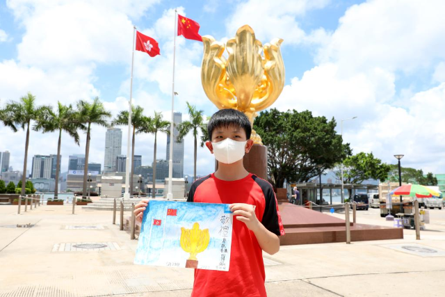 香港小学生曾祥珂带着自己的画作《敬礼——庆祝香港回归25周年》,在父母陪伴下来到金紫荆广场留影,迎接香港回归25周年。记者 吴晓初 摄