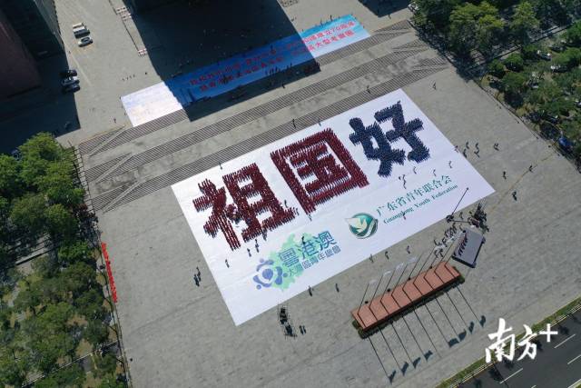 当天,现场气氛热烈欢快,三地青年手持五星红旗,在广场中央集合、排列。从高处俯视,“祖国好”三个大字在骄阳下十分醒目。