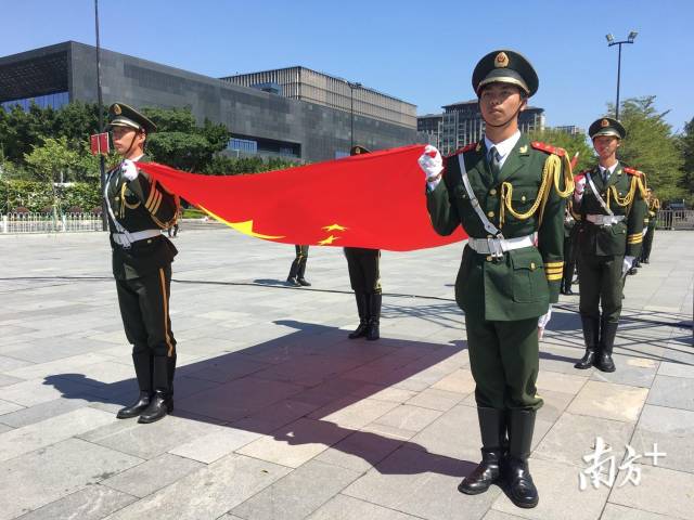 10时50分,来自暨南大学国旗护卫队的18名队员英姿飒爽,护卫着鲜艳的五星红旗,从会场右侧齐步走向升旗台。伴随着国歌奏响,五星红旗冉冉升起,全场青年高声齐唱国歌。