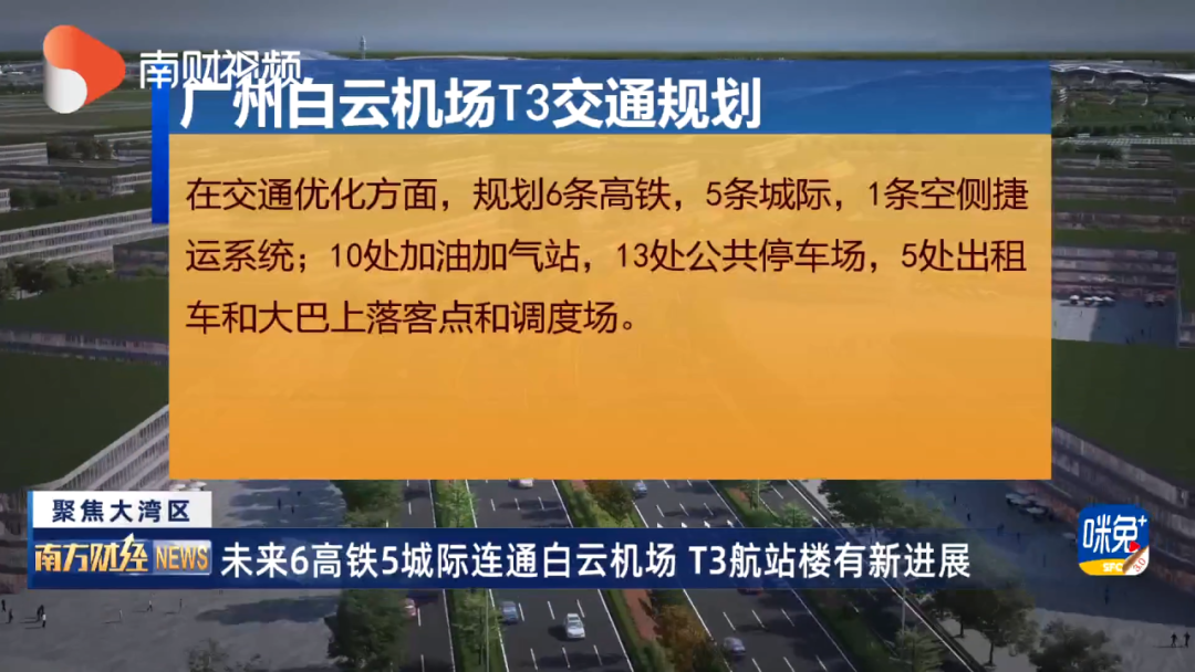 ●根据规划,白云机场将引入6条高铁,分别是:正线引入广珠(澳)高铁、广河高铁;并线引入广湛高铁、贵广高铁广宁联络线、广清永高铁、广深第二高铁。3条城际轨道引入白云机场,分别是:穗莞深城际(新白广段)、芳白城际、广花城际。1条地铁连接机场,即广州地铁3号线。2条高速接驳白云机场,即机场高速、机场第二高速。
