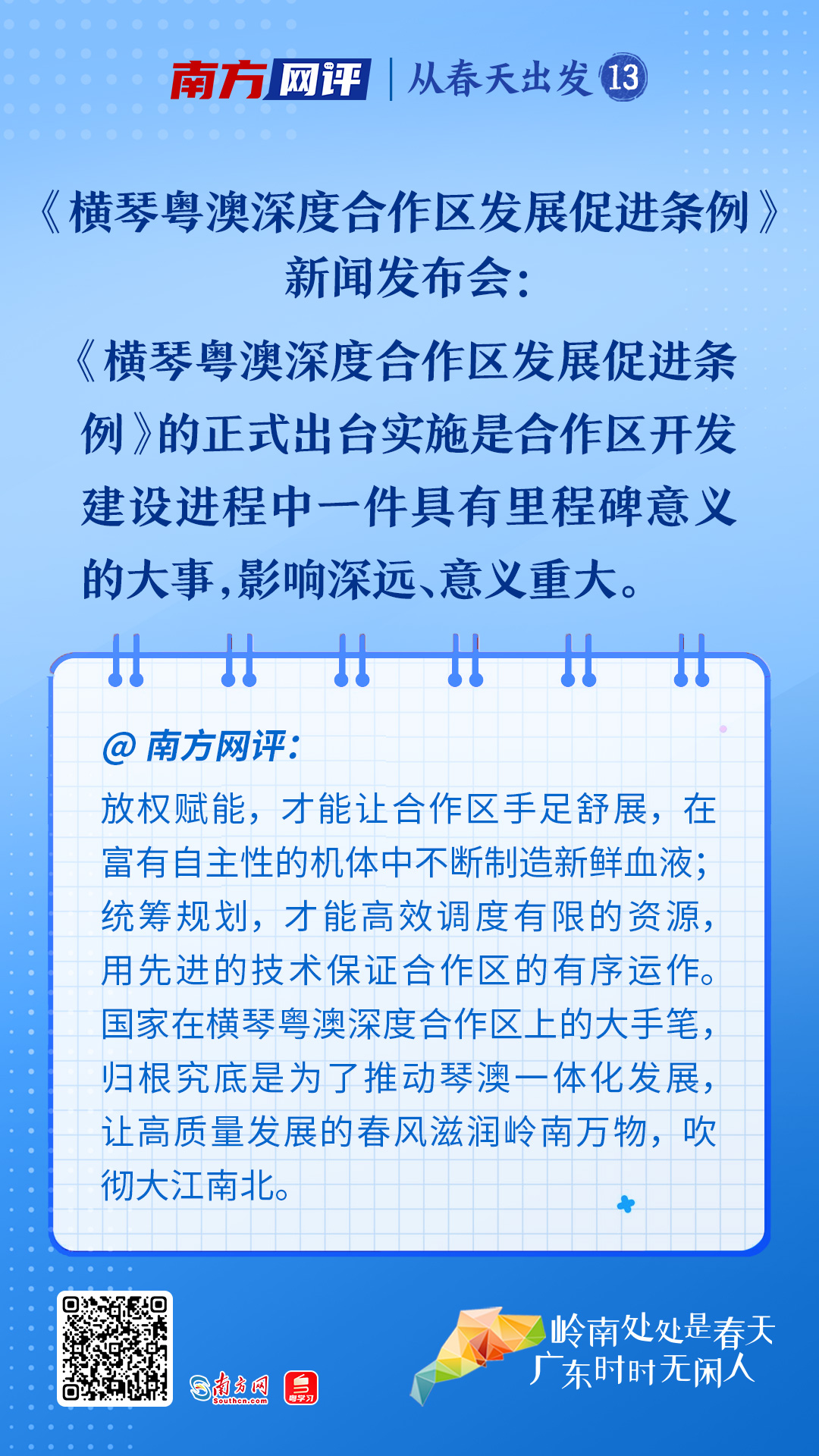 作为合作区的法治后盾,《条例》的发布可谓恰逢其时。高质量发展看广东,而广东的天时、地利、人和,离不开对外开放这场春雨在岭南大地上刻下的印痕。如今,珠江两岸的大平台在海内外崭露头角、奋勇争先,这是千载一时的机遇。广东,与有荣焉!