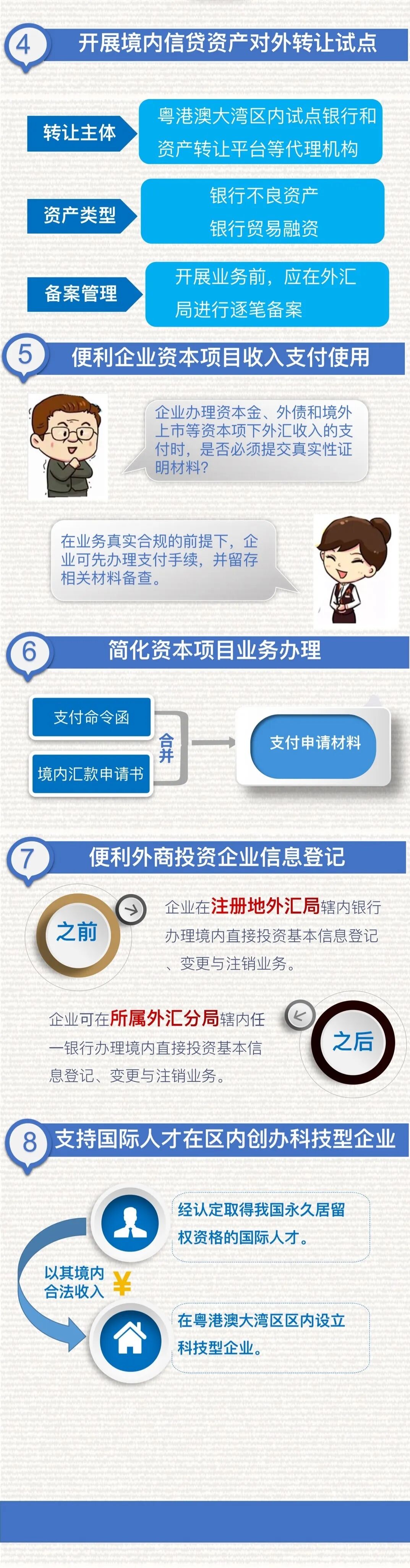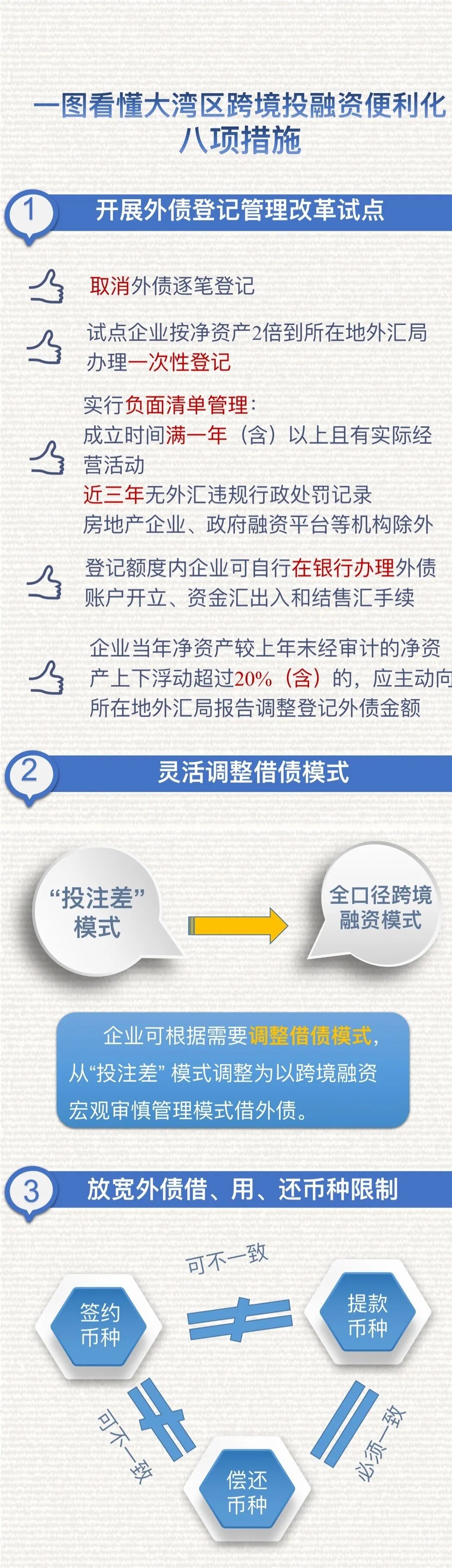 为落实《粤港澳大湾区发展规划纲要》《关于支持深圳建设中国特色社会主义先行示范区的意见》,提升外汇管理服务实体经济发展水平,经国家外汇管理局批准,外汇局广东省分局与深圳市分局联合发布了《关于外汇管理支持粤港澳大湾区和深圳先行示范区发展的通知》(粤汇发〔2020〕15号),明确在粤港澳大湾区开展外债登记管理改革、银行信贷资产对外转让和资本项目收入支付便利化改革等八项试点业务。